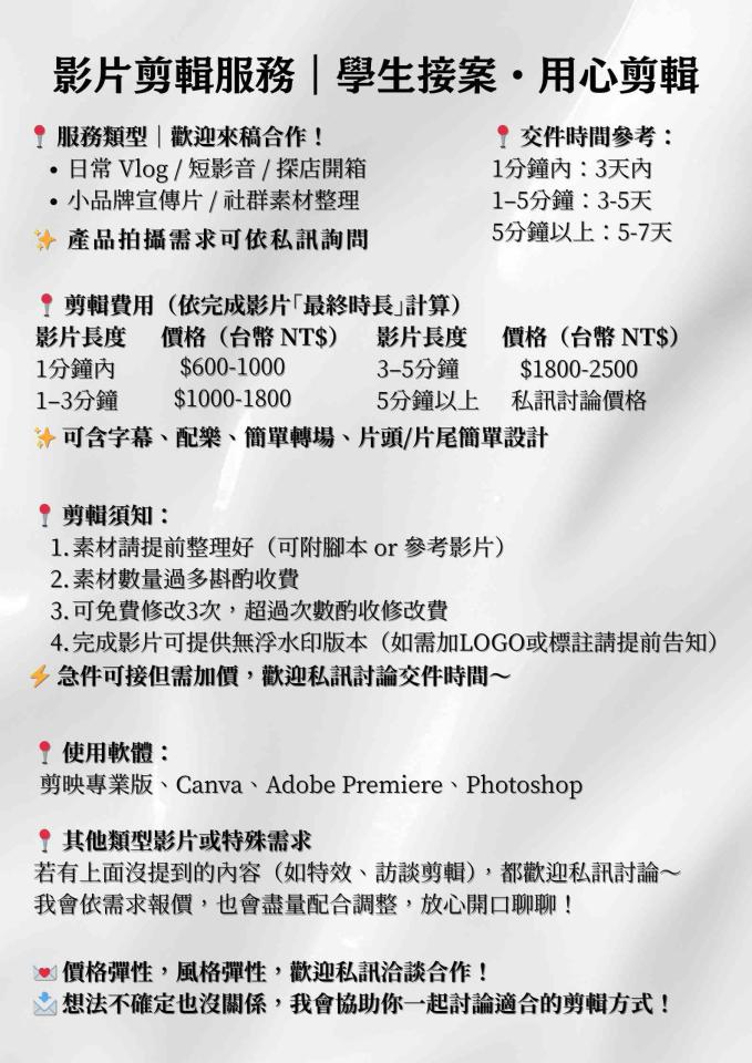有多次很多品牌跟個人剪過短影片(商業、Vlog、產品行銷、清潔都做過💖)