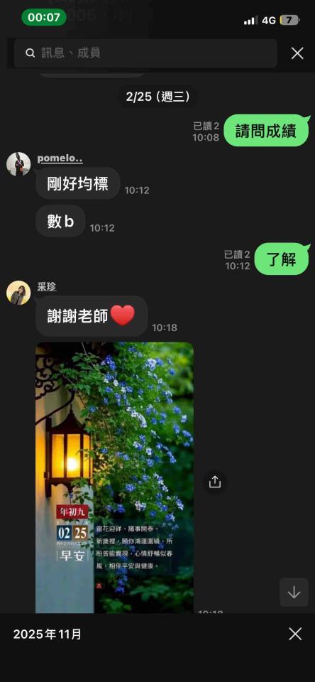 •經我指導兩次段考後由2.30分進步到7.80,並維持(南二中)