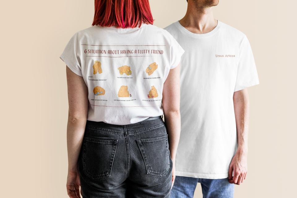 本頁呈現插畫應用於實體商品與展示物件的情境,如服飾與桌曆模擬。設計重點在於插畫如何轉化為可量產的商品視覺,並保持風格一致與實用性。