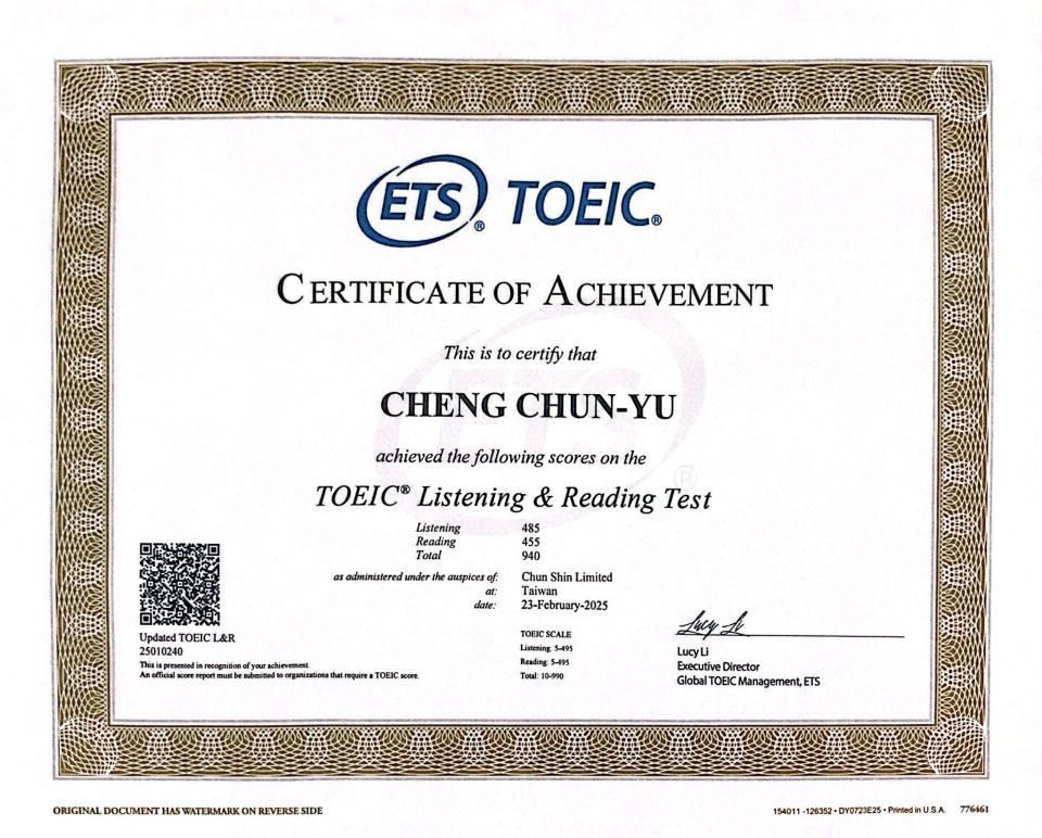 演講實績: 曾獲多次中英文即席演講比賽獎項,具備極強的臨場應變與口語邏輯。