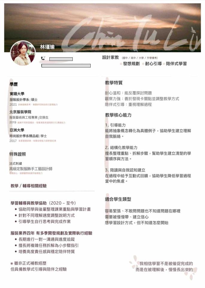 常見問題 1.自我介紹 我是Chris服裝設計本科背景 過去於台灣女裝品牌從事商品開發相關工作 在品牌端長期與企劃及製作端協作 負責將企劃方向與需求整理轉化為可執行的款式設計 熟悉從初期概念、風格方向整理 到款式落地與工廠端可讀文件的整體流程 能協助在開發過程中釐清需求、降低來回溝通成本 目前正在 自由接案 並開放 設計家教 中 設計家教範圍: 。學生/報考設計系者作品集整理 。設計系學生作業輔助 自由接案範圍: ・開發初期主題定位與細節統籌 ・款式開發與設計建議 ・工程圖與制單製作 ・與工廠端的開發溝通協助 若有合適的合作方式,歡迎進一步討論 謝謝✨ 2.專業背景 。實踐大學 服裝設計系 碩士 。北京服裝學院 交換生 。亞洲大學 時尚設計系 學士