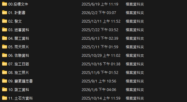 具備獨立統籌工程全週期資料之能力,從初期標單製作、施工三合一計畫、材料送審、施工日誌、各期估驗撥款,直至末期竣工圖、結算驗收作業,皆能精準交付。